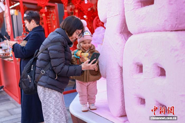 2月12日,家长带着小朋友在市集上打卡拍照。临近春节,北京隆福寺新春市集上市民游客络绎不绝,超30家老字号扎堆亮相,各式马年新春特色产品琳琅满目。记者 贾天勇 摄