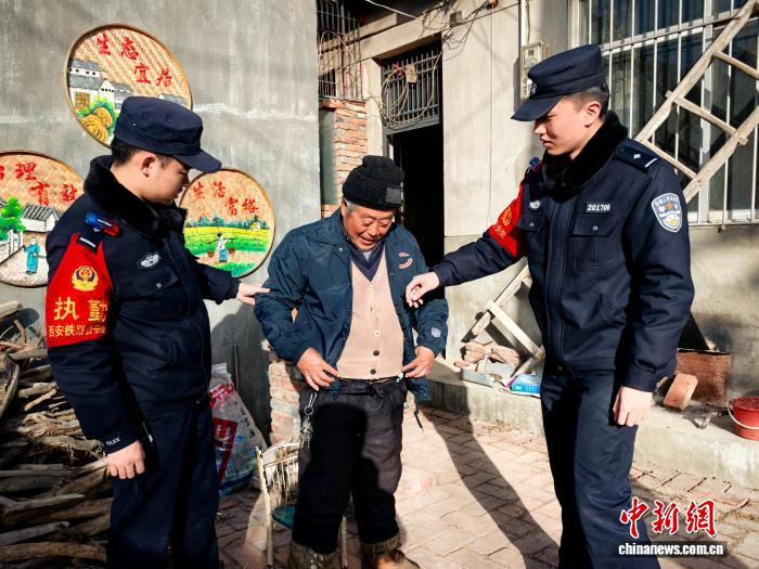 图为青年民警倪泽宇、宋明洋向老乡送去爱心衣物。王小东 摄