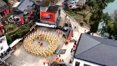 2月12日,人们在江苏省扬州市汤汪街道的年货大集选购年货(无人机照片)。