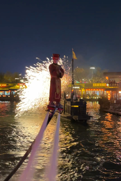 白日里,百场演艺轮番上演。《岳飞枪挑小梁王》马蹄铿锵,尽显忠勇气概;《大宋·东京保卫战》水战激荡,再现金戈铁马;非遗舞龙舞狮腾跃,民俗绝活轮番亮相,锣鼓声里年味沸腾。新上线的《清明上河·茶会》以宋代四雅为脉,点茶、焚香、插花、挂画,一器一味、一步一景,把宋人的雅致与从容,慢煮成新春里的诗意清欢。