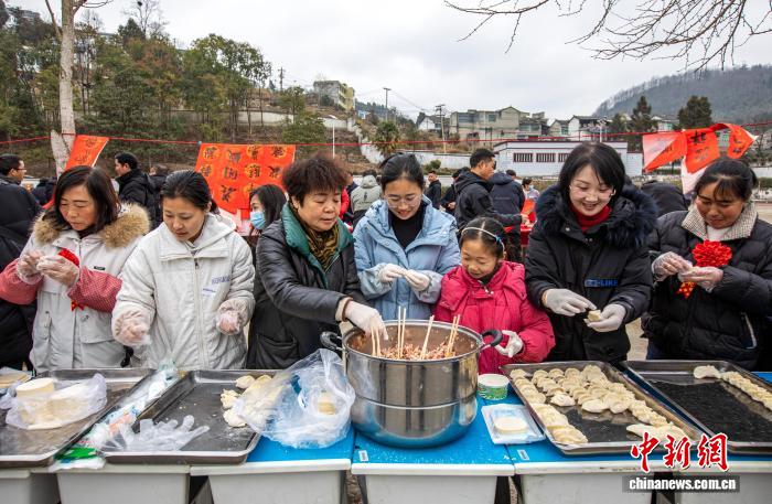图为2月12日,贵州省黔西市定新彝族苗族乡迎春活动现场,村民在包饺子。史开心 摄