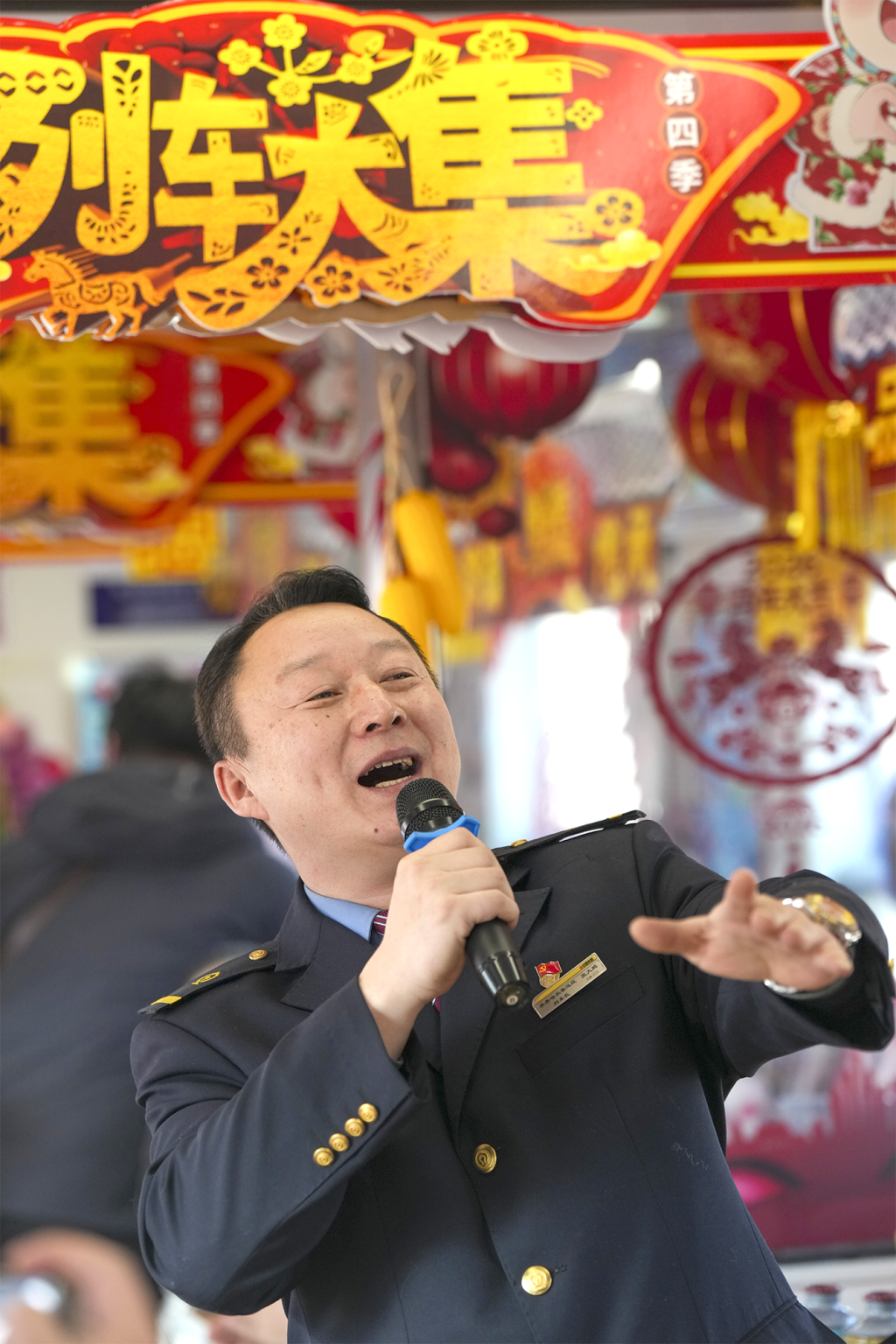 2月4日,在K7103次“列车大集”车厢内,列车长为旅客进行表演。