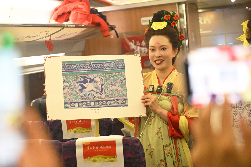 2月9日,在G848次列车上,敦煌研究院工作人员着敦煌壁画中的供养人服饰向旅客讲述敦煌壁画中的马元素。