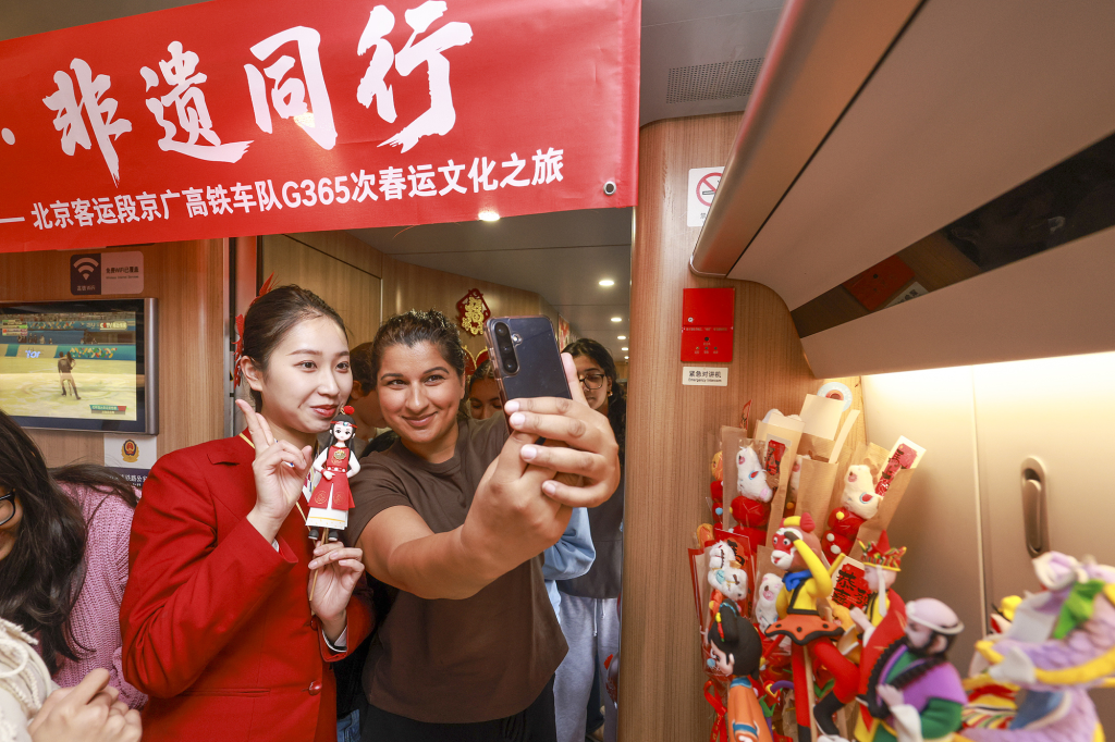 2月10日,北京,外籍旅客参观车厢内展示的面塑后打卡留念。