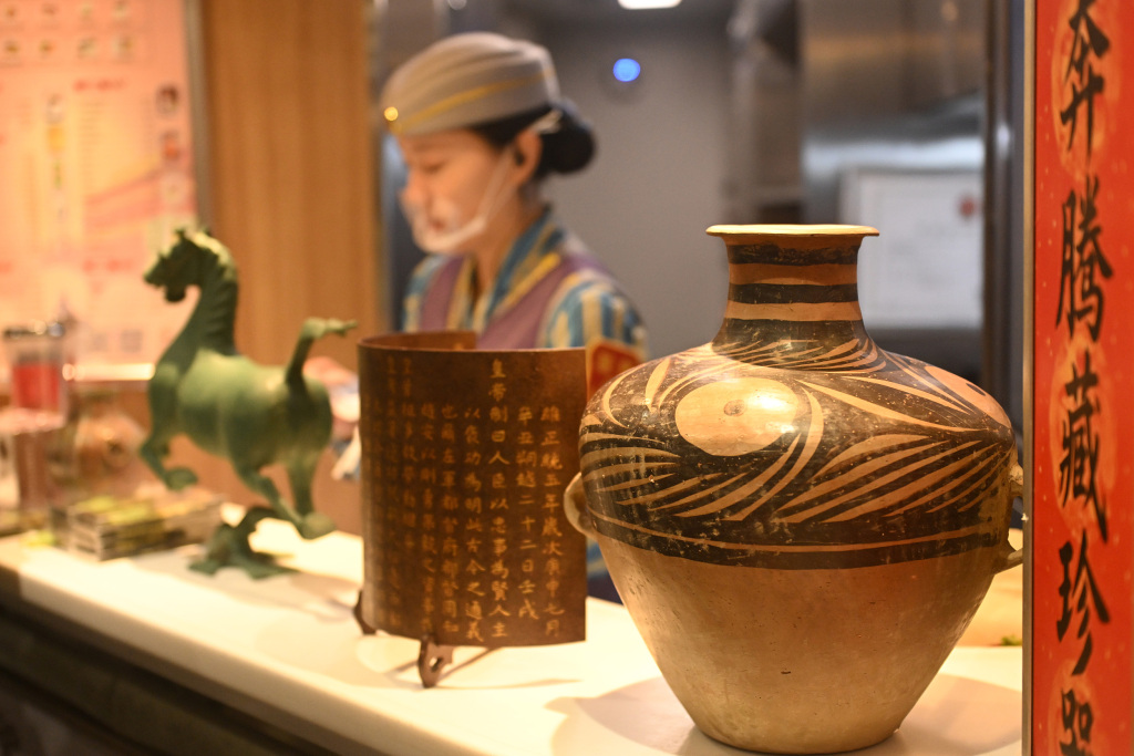 展陈在G848次列车上的铜奔马等国宝文物复制品。