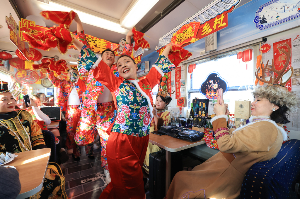 2月4日,在K7103次列车上,身穿民俗服饰的乘务员为旅客表演。
