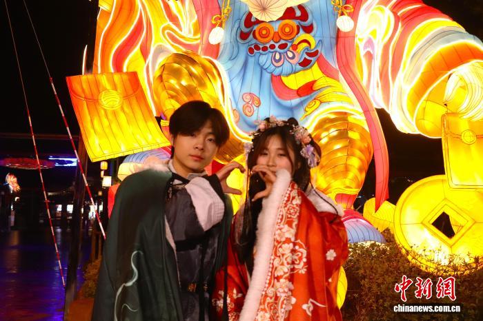 图为身着汉服的游客与花灯合影。 熊锦阳 摄