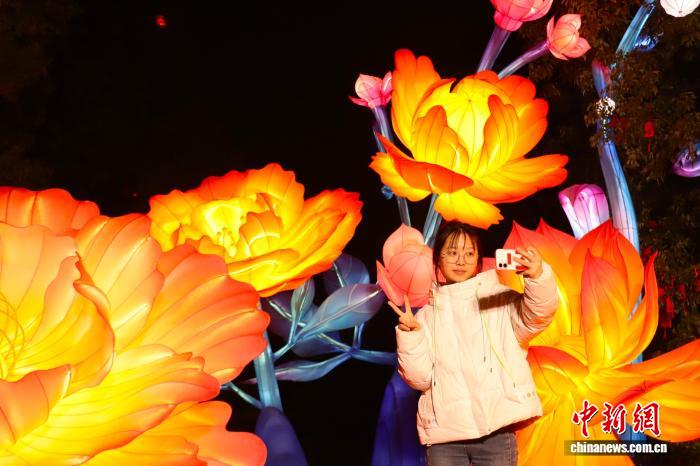 图为与花灯合影留念的游客。 熊锦阳 摄