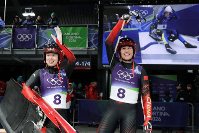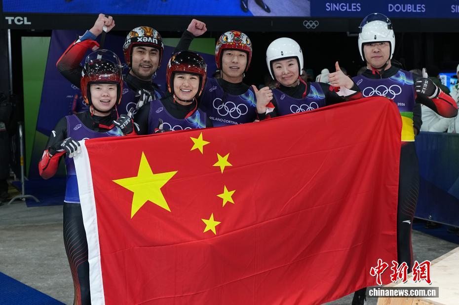 当地时间2月12日晚,2026年米兰-科尔蒂纳冬奥会雪橇团体接力赛在科尔蒂纳滑行中心举行。中国队以3分46秒842的成绩位列第七,刷新队史最佳成绩。图为中国队选手赵佳颖、居巴依·赛克依、古丽洁乃提·阿迪克尤木、侯硕、王沛宣、鲍振宇(左至右)在赛后合影。