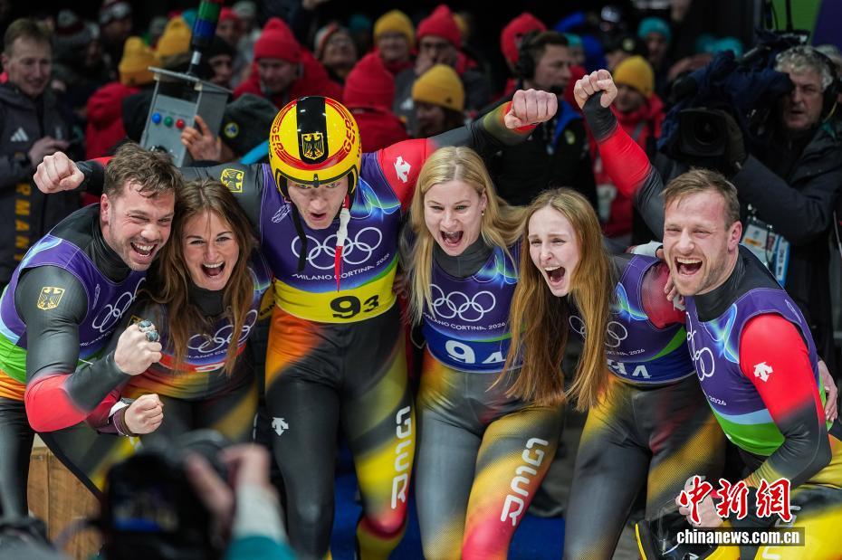 当地时间2月12日晚,2026年米兰-科尔蒂纳冬奥会雪橇团体接力赛在科尔蒂纳滑行中心举行。德国队以3分41秒672的成绩打破赛道纪录夺得金牌,并实现在冬奥会该项目上的四连冠。图为德国队在赛后合影。