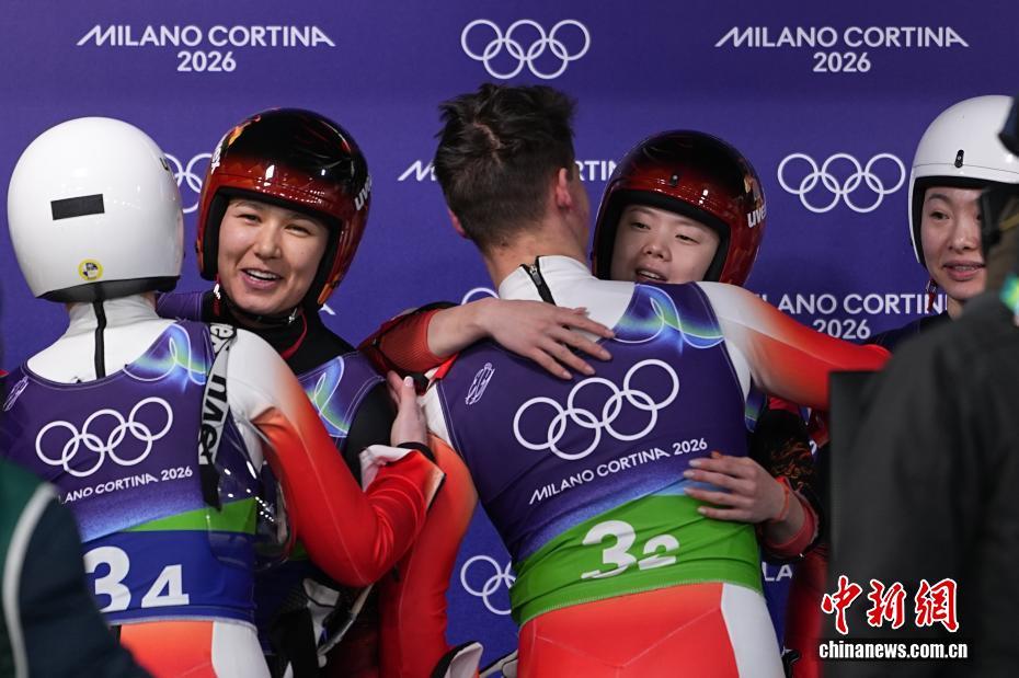 当地时间2月12日晚,2026年米兰-科尔蒂纳冬奥会雪橇团体接力赛在科尔蒂纳滑行中心举行。中国队以3分46秒842的成绩位列第七,刷新队史最佳成绩。图为中国队选手古丽洁乃提·阿迪克尤木(左二)、赵佳颖(左四)等在接受赛后采访时与波兰队选手拥抱。