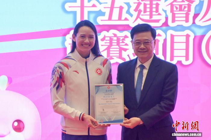 2月12日,第十五届全国运动会(简称“十五运会”)和全国第十二届残疾人运动会暨第九届特殊奥林匹克运动会(简称“残特奥会”)香港特区代表团嘉许礼在香港马鞍山体育馆举行,一众在运动会中表现卓越的香港运动员获颁嘉许状。图为香港特区行政长官李家超(右)向香港游泳运动员何诗蓓颁发嘉许状。 中新网记者 陈永诺 摄