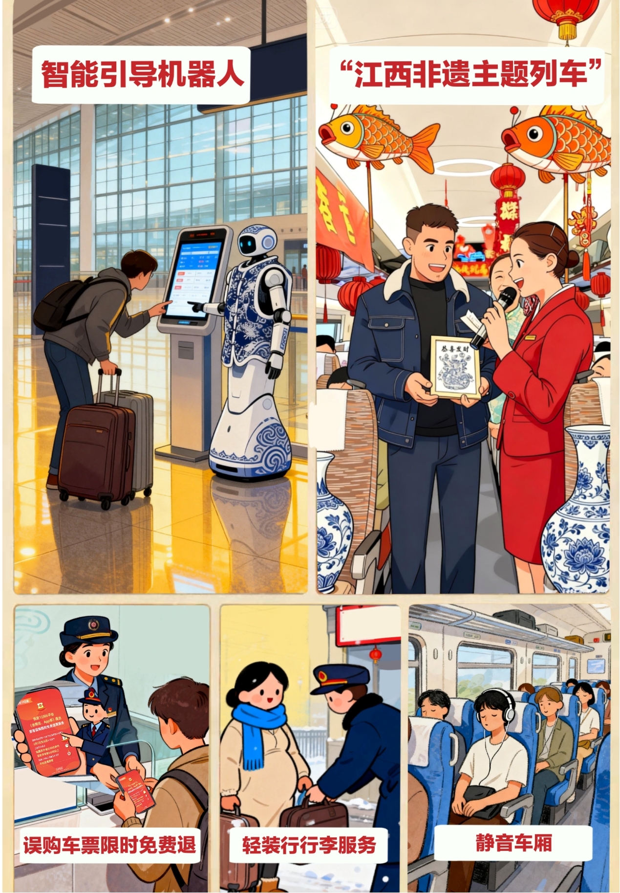 创新赋能春运服务,让旅途既有品质更具内涵。景德镇北站的智能引导机器人可快速查询车次、提供多语种服务,成为瓷都车站的“智能暖心向导”;南昌西至北京西的G336次“江西非遗主题列车”,将车厢打造为流动文化空间,婺源鲤鱼灯、景德镇青花瓷等非遗元素巧妙融入车厢,让旅客在飞驰的旅途中沉浸式感受传统文化的魅力,成为非遗文化的传播者。