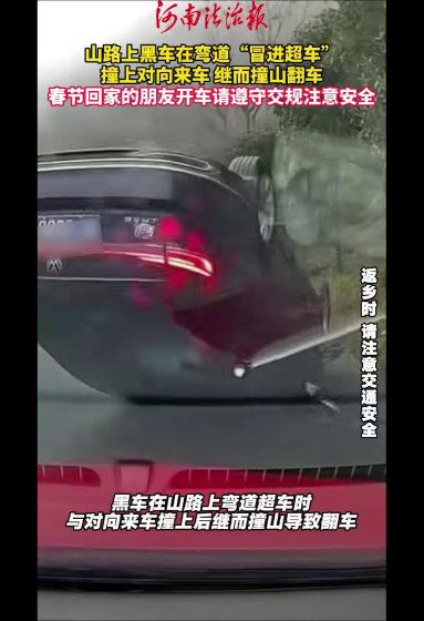 山路上黑车弯道超车时与对向小车剐蹭 下一秒黑车撞山后翻车