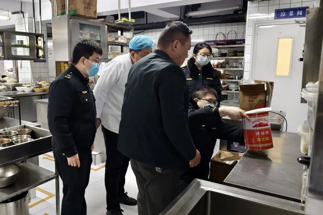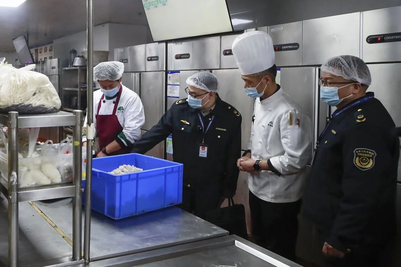 2月12日,鹤壁市市场监管局执法人员在樊氏厨艺开展年夜饭餐饮单位检查