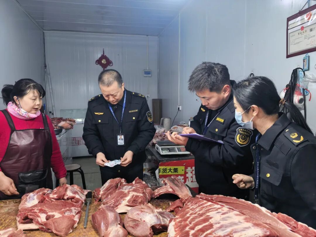2月10日,平顶山市湛河区市场监管执法人员在火车站综合市场开展肉制品安全检查
