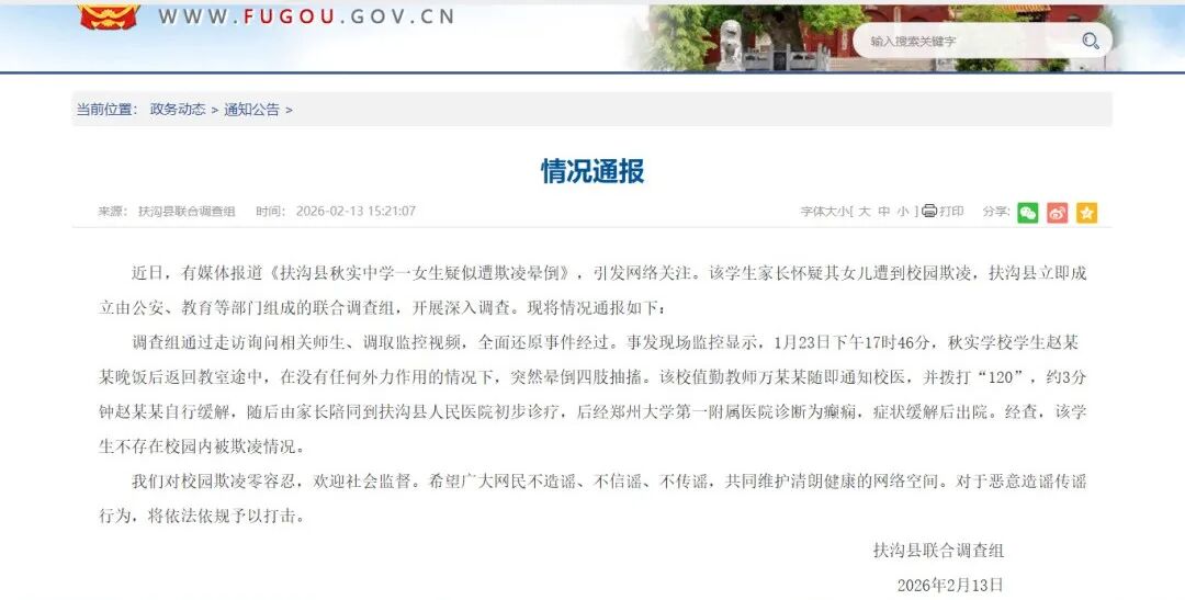 近日,有媒体报道《扶沟县秋实中学一女生疑似遭欺凌晕倒》,引发网络关注。该学生家长怀疑其女儿遭到校园欺凌,扶沟县立即成立由公安、教育等部门组成的联合调查组,开展深入调查。现将情况通报如下: