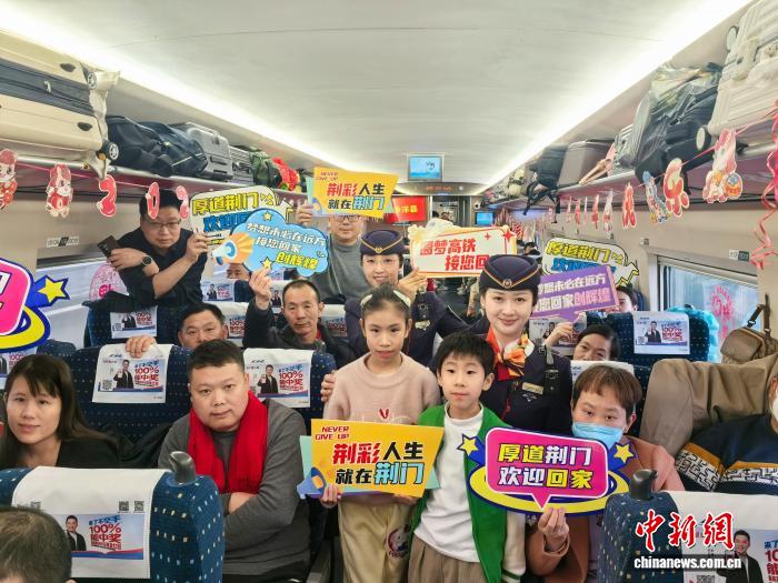 列车上,温馨氛围与务实服务相得益彰:人社、住建、教育等部门的工作人员主动靠前,现场为返乡人员解读就业创业、安居住房、子女入学等惠民政策,把政策服务送到群众身边;亿纬动力、长城汽车等10家荆门重点企业的招聘代表现场设点,与务工人员面对面交流岗位信息、洽谈就业意向,将“招聘会”搬进高铁车厢,让游子在归途上就能对接家乡发展机遇,实现“返乡即能寻岗,归乡即可创业”。