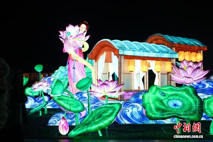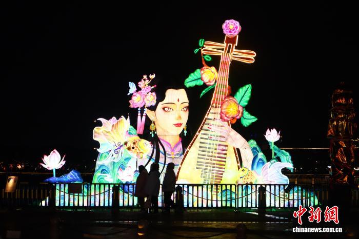 2月7日晚,浙江平湖,以平湖派琵琶为灵感的“琵琶仙女”灯组吸引民众欣赏。春节临近,当地“金平湖灯秀”深挖本土文化根脉,45组主题灯组搭配千盏氛围灯,以平湖非遗、在地文化等为视觉与内容基底,打造可感知、可体验的沉浸式光影叙事,民众穿梭其间感受浓浓年味。中新社记者 黄彦君 摄