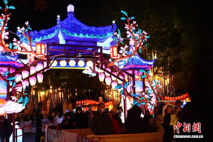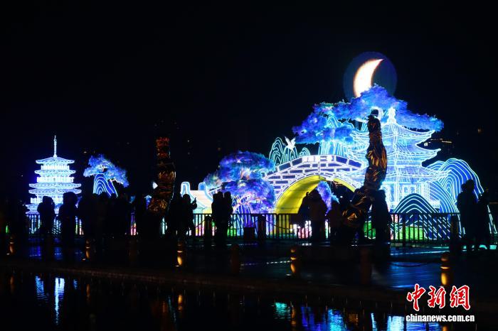 2月7日晚,浙江平湖,民众在灯会游玩。春节临近,当地“金平湖灯秀”深挖本土文化根脉,45组主题灯组搭配千盏氛围灯,以平湖非遗、在地文化等为视觉与内容基底,打造可感知、可体验的沉浸式光影叙事,民众穿梭其间感受浓浓年味。中新社记者 黄彦君 摄