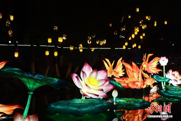 2月7日晚,浙江平湖,设置在水上的“荷间鲤戏”灯组。春节临近,当地“金平湖灯秀”深挖本土文化根脉,45组主题灯组搭配千盏氛围灯,以平湖非遗、在地文化等为视觉与内容基底,打造可感知、可体验的沉浸式光影叙事,民众穿梭其间感受浓浓年味。中新社记者 黄彦君 摄