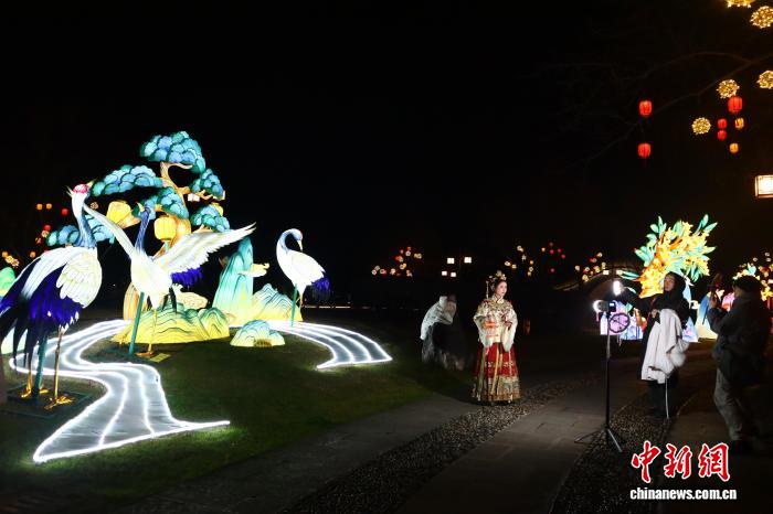 2月7日晚,浙江平湖,民众在“松鹤延年”灯组前拍照打卡。春节临近,当地“金平湖灯秀”深挖本土文化根脉,45组主题灯组搭配千盏氛围灯,以平湖非遗、在地文化等为视觉与内容基底,打造可感知、可体验的沉浸式光影叙事,民众穿梭其间感受浓浓年味。中新社记者 黄彦君 摄