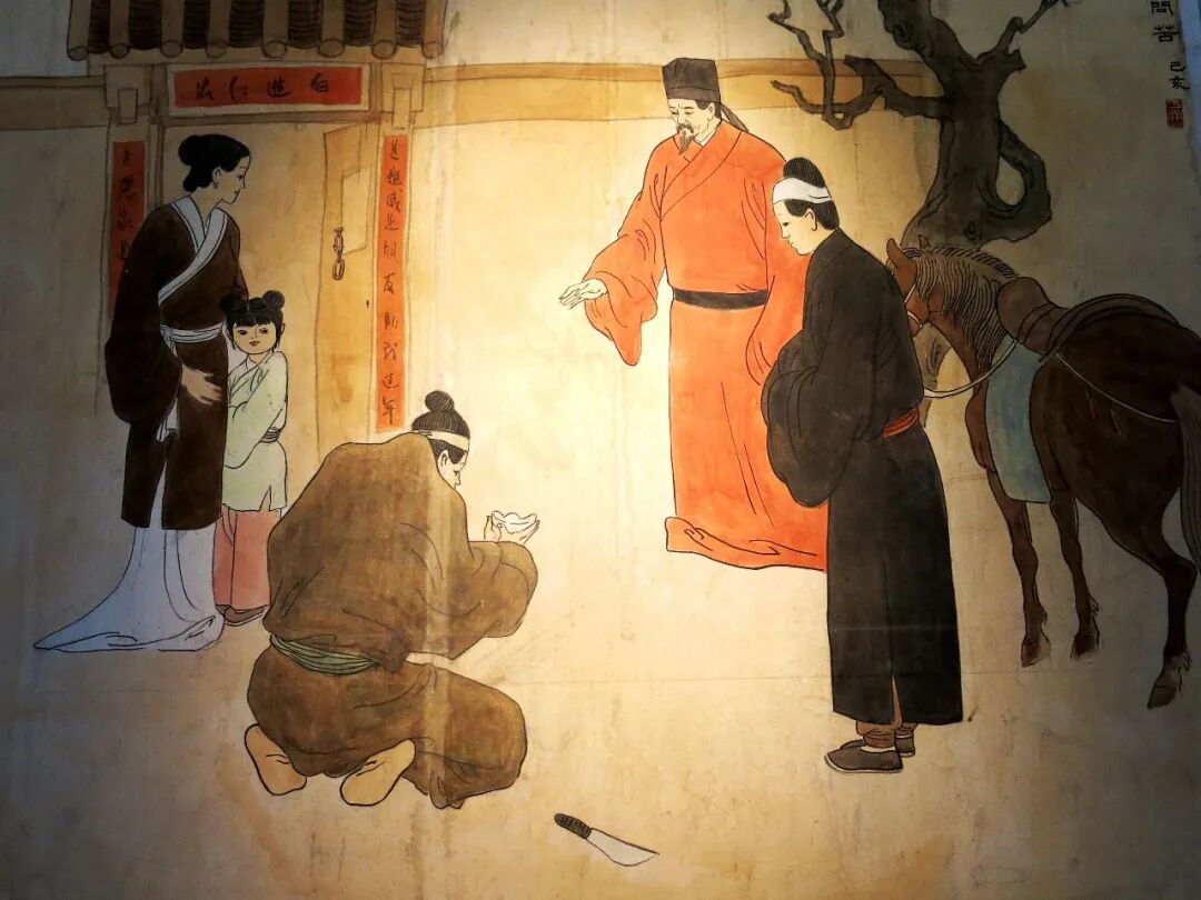 金代大诗人元好问在内乡任县令时,有一年大年三十,他带人到民间微服私房,当行至内乡县三里桥时,见一家农户门上贴着一副对联,上联是:是亲戚,是朋友,助我过年;下联是:是冤家,是对头,登门要钱。横批:白进红出。在门前一男子持刀而立,屋内一妇女呜呜直哭,元好问进入屋内细心询问,方知该夫妻因父母染病久治不愈,相继死去,因此债台高筑,年关将至,讨账的登门不绝,则出此下策借以抗债,元好问对此遭遇深表同情,遂赠纹银十两以为生计。