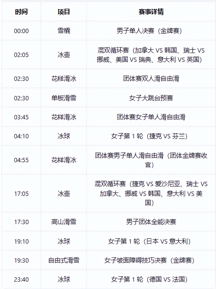 日间至晚间,雪上与冰上赛事持续推进。17:05 多场冰壶混双循环赛继续进行,17:30 高山滑雪男子团体全能决赛上演;19:10、23:40 各有一场女子冰球小组赛,19:30 迎来当日焦点 —— 自由式滑雪女子坡面障碍技巧决赛,谷爱凌、韩林杉、刘梦婷三位中国选手将冲击奖牌,全天赛事覆盖雪上技巧、竞速、冰球、冰壶等多个领域,看点十足。