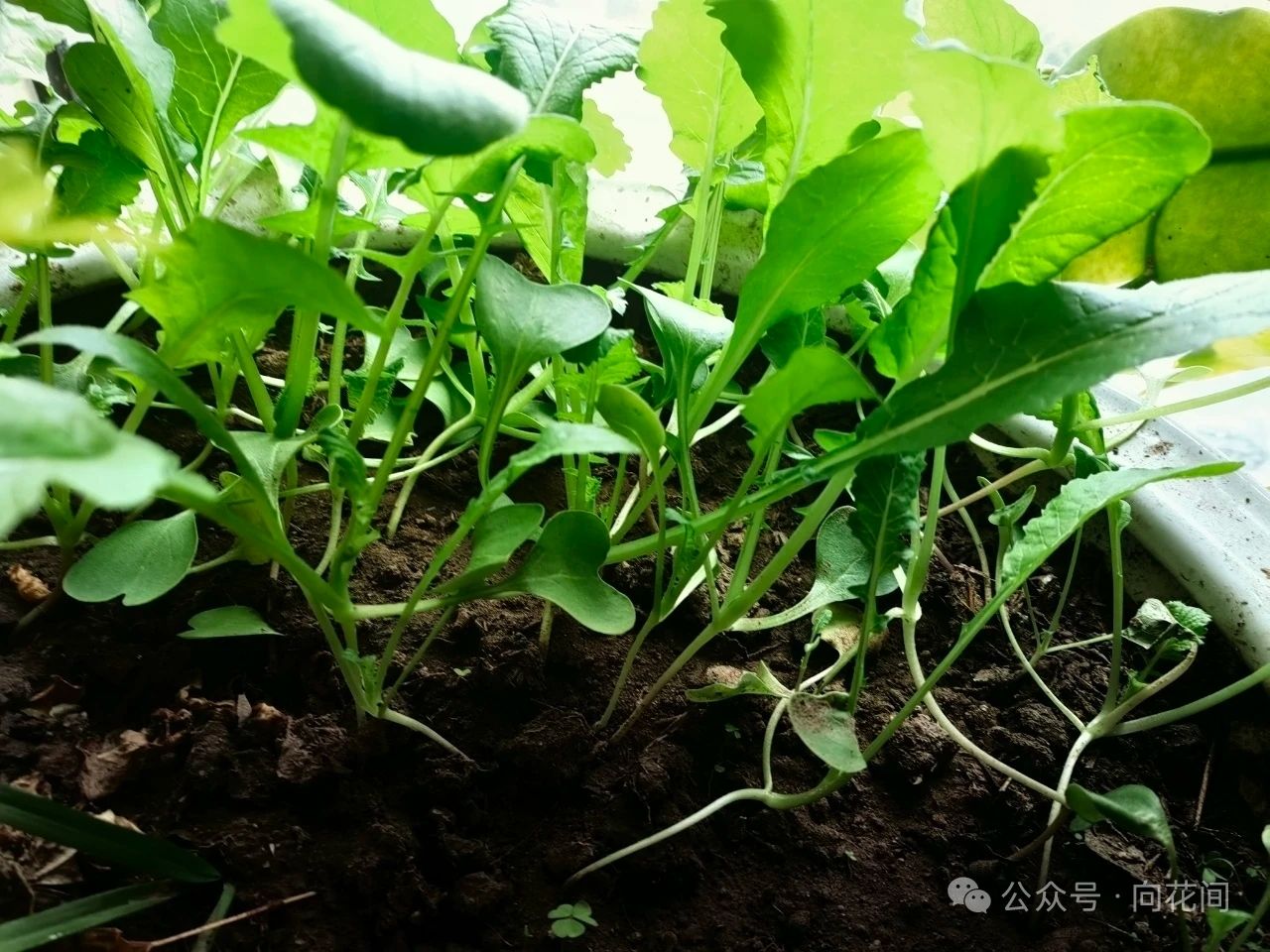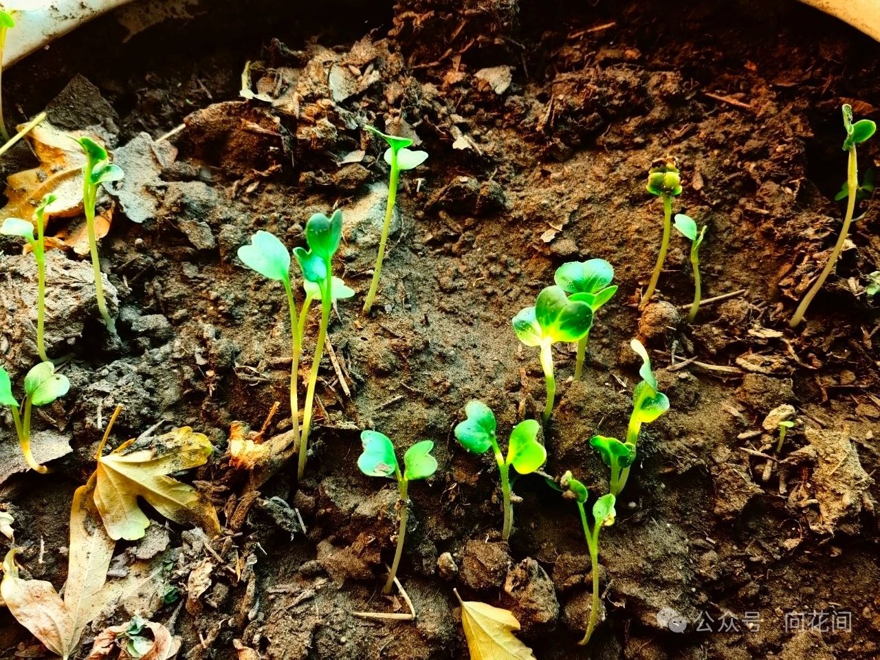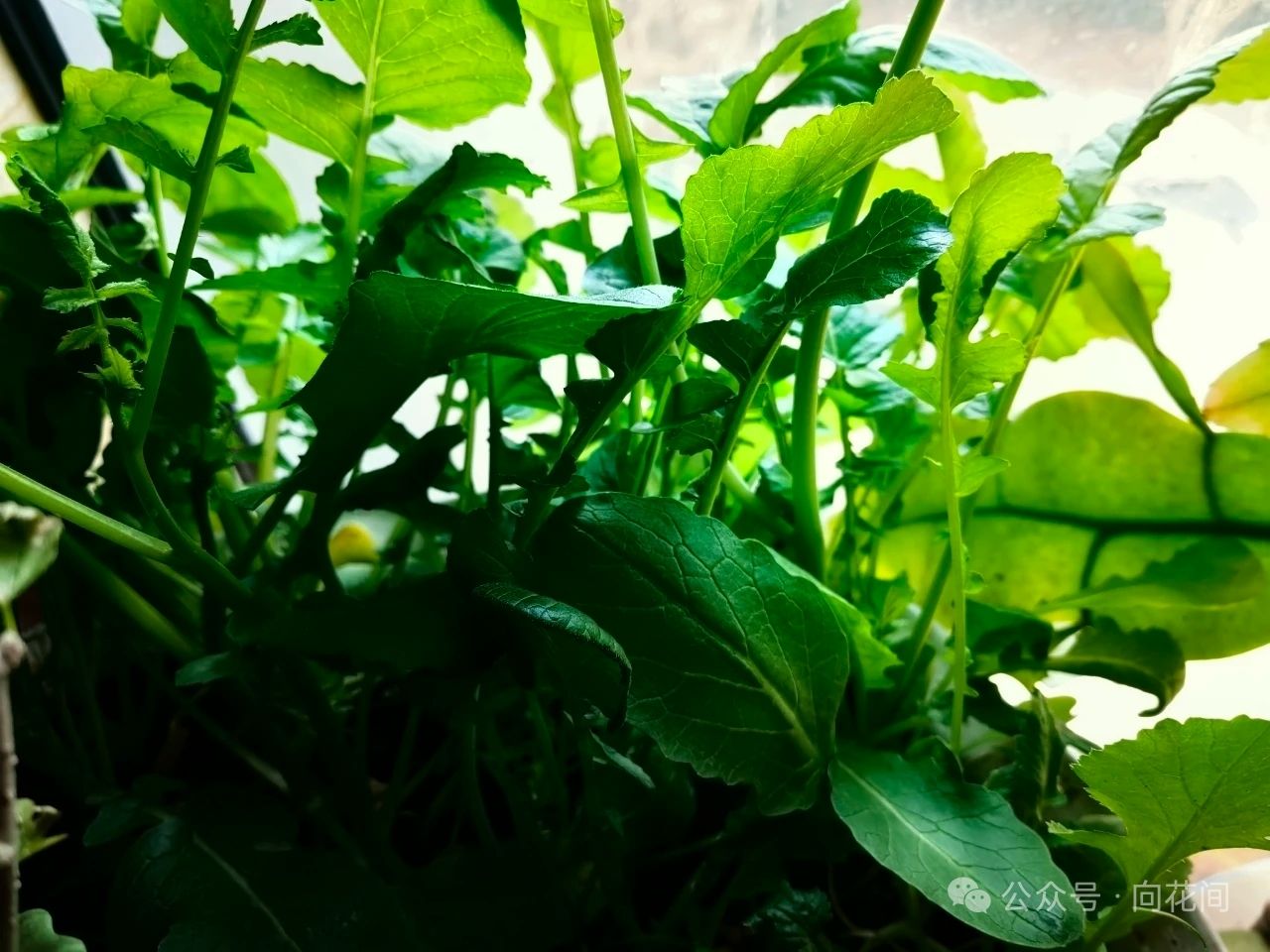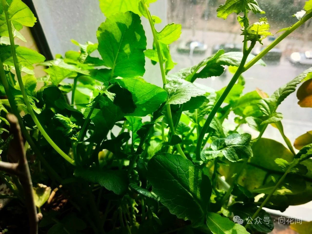 阳台上的萝卜缨菜薹,你一定没见过。花盆里的菠菜全部采收后,种上了萝卜。10多天后,钻出了两片对生叶片。慢慢地,长成了一片摇曳的碧色。