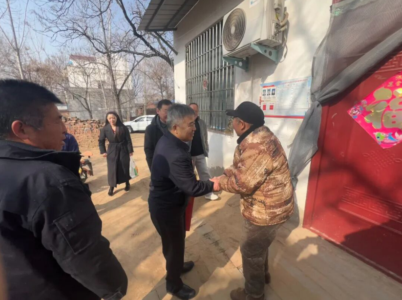 全媒体记者李政亭 通讯员李长磊报道 2月4日,开封市儿童医院党委书记储进、党委委员郭保军带领医院工作人员专程来到兰考县葡萄架乡转香庙村和韩湘坡村走访慰问两村干部群众和驻村工作队员,为乡亲们送去新春祝福和慰问品。