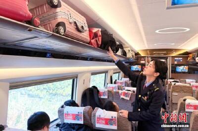 董泓辰在高铁列车车厢内,对行李架上的箱包进行安全检查。中新网记者 殷立勤 摄