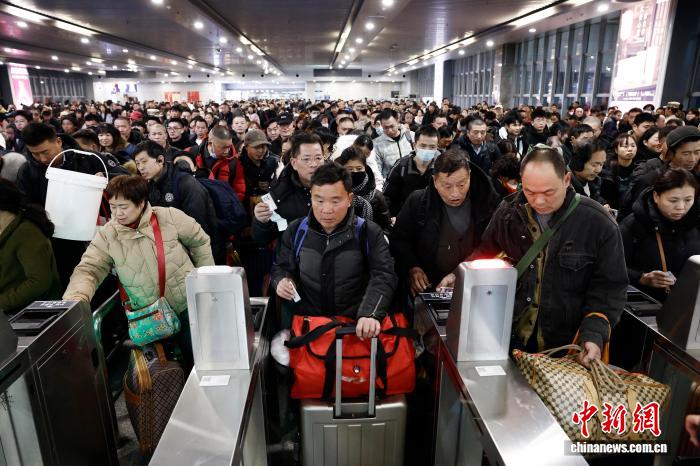 图为2月8日晚,旅客在铁路上海站候车大厅有序检票。中新社记者 殷立勤 摄