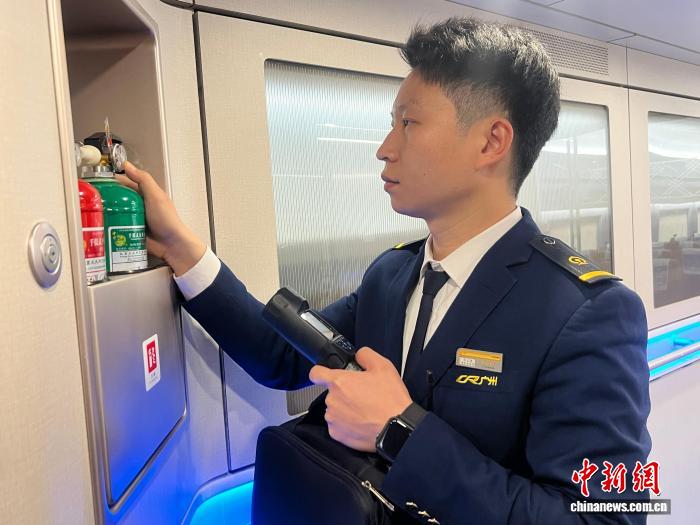 广州动车段随车机械师劳文正在列车上巡检。国铁广州局 供图