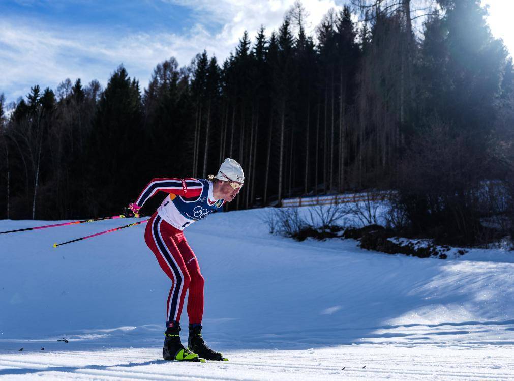 2月8日,冠军挪威选手克莱博在比赛中。当地时间2月8日,米兰-科尔蒂纳冬奥会越野滑雪男子双追逐比赛在意大利泰塞罗举行。新华社记者 彭子洋 摄