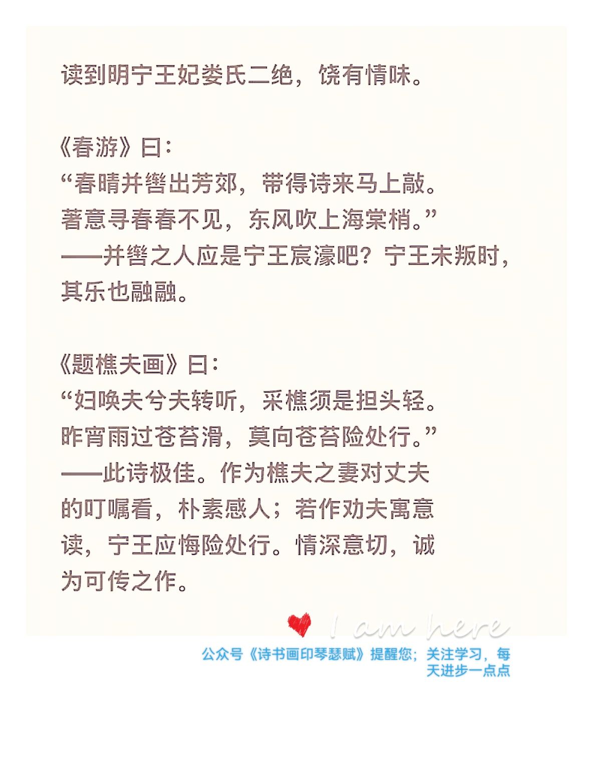 "妇唤夫兮夫转听,采樵须是担头轻。昨宵雨过苍苔滑,莫向苍苔险处行。"-﹣此诗极佳。作为樵夫之妻对丈夫的叮嘱看,朴素感人;若作劝夫寓意读,宁王应悔险处行。情深意切,诚为可传之作。