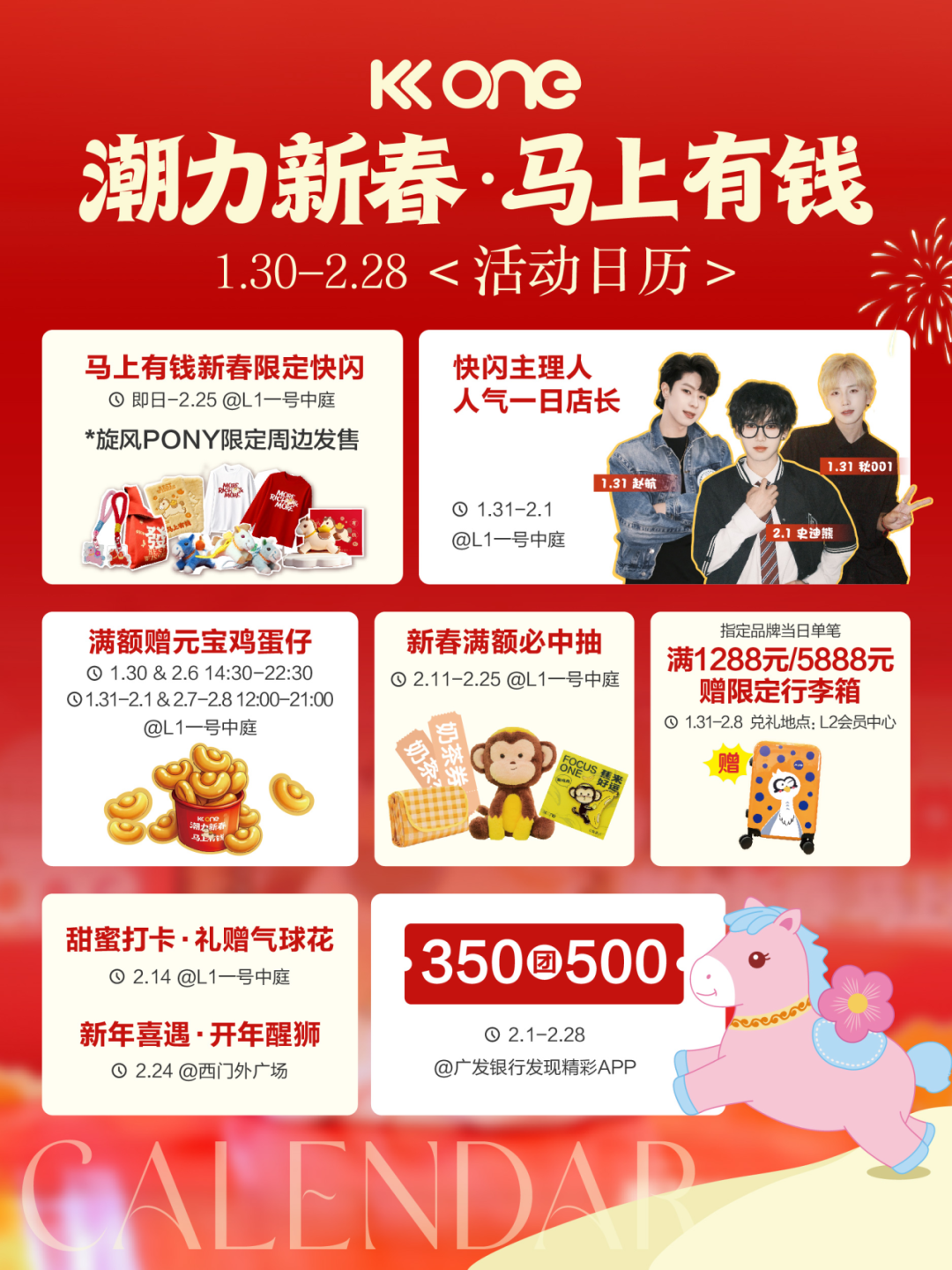 即日起-2.25:「马上有钱」新春限定快闪店登陆L1中庭,旋风PONY周边限定发售,打卡就能沾财气。还有满额必中抽奖、广发银行“350团500”等实在优惠。
