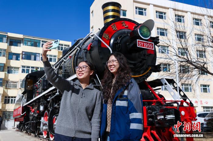 图为汝佳仪(左)与同事在蒸汽机车车头前留念。中新社记者 薛蒂 摄