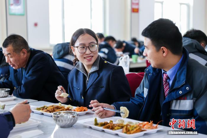 图为汝佳仪(中)在食堂与同事聊天。中新社记者 薛蒂 摄