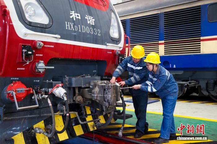 图为汝佳仪检查电力机车风管路。中新社记者 薛蒂 摄