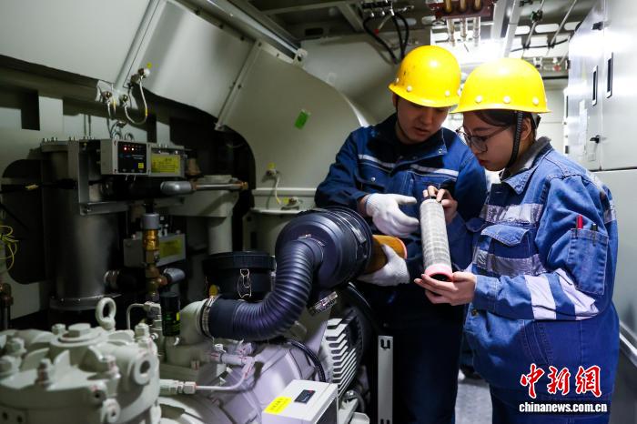 图为汝佳仪(右)与同事一起更换风泵滤芯。中新社记者 薛蒂 摄