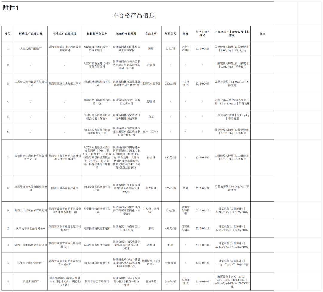 针对本次公布的不合格食品,陕西省市场监督管理局表示,已要求属地市场监管部门依法调查处理,责令采取下架、召回等风险控制措施,并将及时把企业采取的风险防控措施和核查处置情况向社会公开。