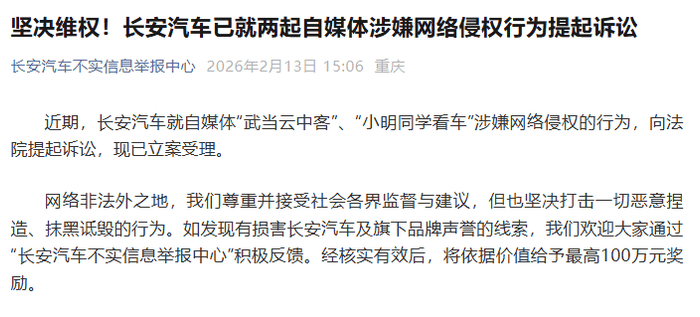 2月13日,长安汽车通过“长安汽车不实信息举报中心”微信公众号发布正式声明,就自媒体账号“武当云中客”“小明同学看车”涉嫌发布不实信息、侵害企业名誉权一事向法院提起诉讼,目前相关案件已获立案受理。