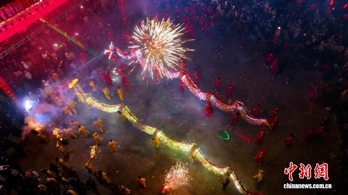 2月10日,山西省晋城市陵川县平城镇的夜色被两条纸龙点亮。徐林 摄