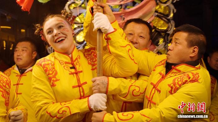 2月10日,美国人黎悦诗在晋城市陵川县体验舞龙。徐林 摄