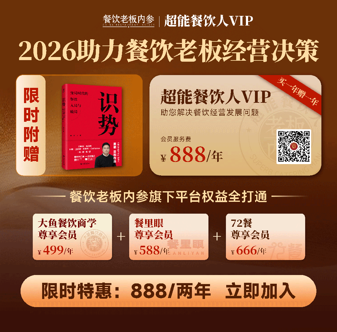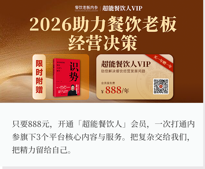 而超能餐饮人会员直接把三个平台打包,只要888元,大鱼餐饮商学+餐里眼+72餐全部开通,而且买一年送一年为你身边那套稳定、可靠、随时可用的工具,陪你在复杂环境中,做出更从容的选择。