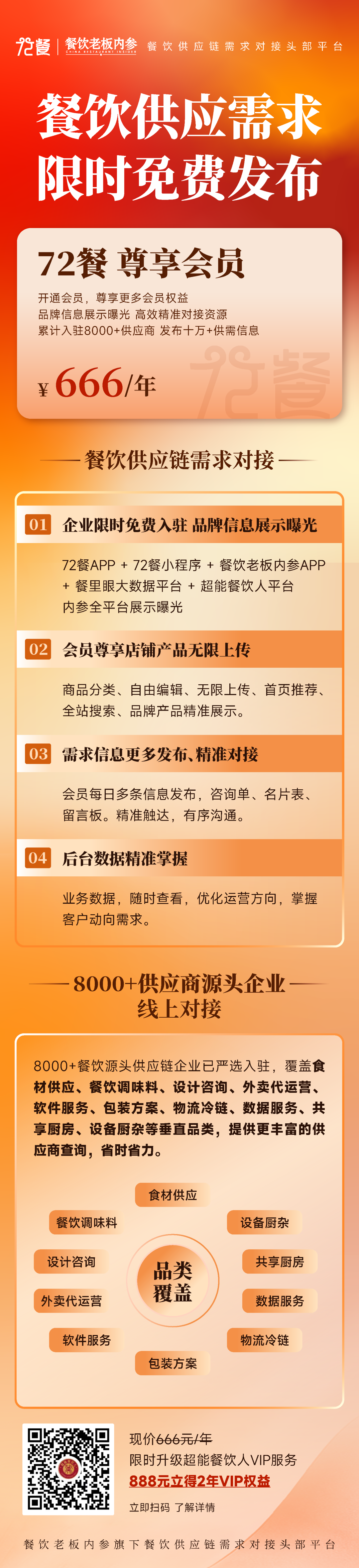 72餐,餐饮老板内参旗下聚焦餐饮供应链的供需对接头部平台,拥有20万+平台用户,8000+ 入驻企业。找供应链,不用再到处打听。