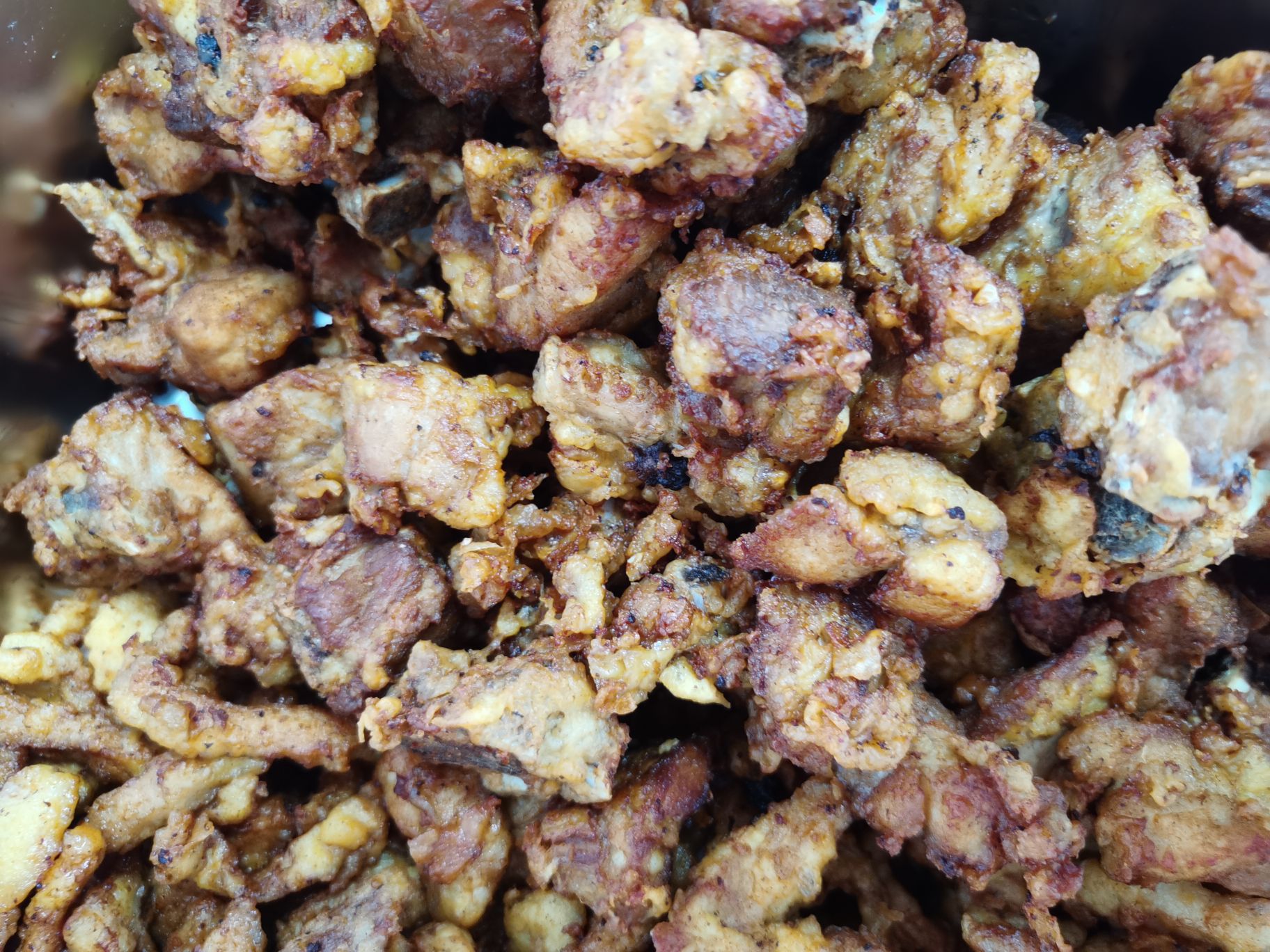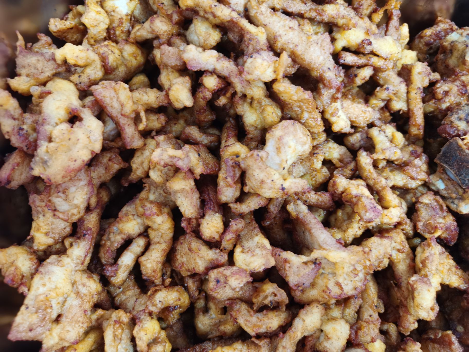 接着是炸酥肉,切好的猪肉裹上调至好的面糊,放入油锅中炸至金黄。