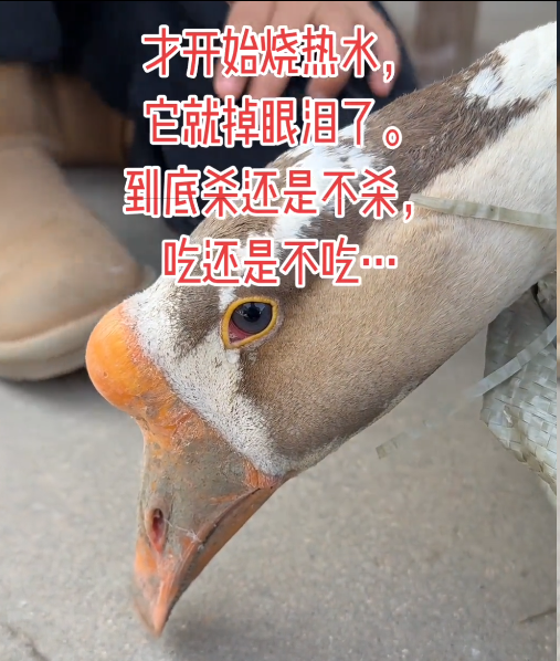 近日,社交平台上一条视频引发广泛关注, 视频中一只大鹅垂头,嘴尖着地,眼角湿润并流下眼泪,地上能看到泪渍,视频中有小孩的声音:“咋一动不动”?该视频文案为:才开始烧热水,它就掉眼泪,到底杀还是不杀、吃还是不吃?不少网友喊话求放过,劝视频发布者不要杀了。