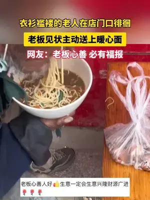 衣衫褴褛的老人在店门口徘徊,老板见状主动送上暖心面。网友:老板心善,必有福报!#暖心 #正能量