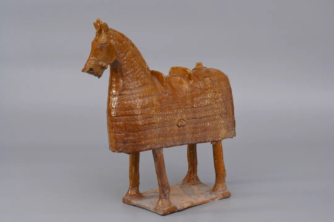 这件黄褐釉陶铠甲马出土于陕西省咸阳市平陵乡北朝墓葬中。马的全身穿有铠甲,工艺精湛,造型别致;马嘴的位置有马衔和马镳(biāo),马背上设置有马鞍,双侧还附有金属马镫。